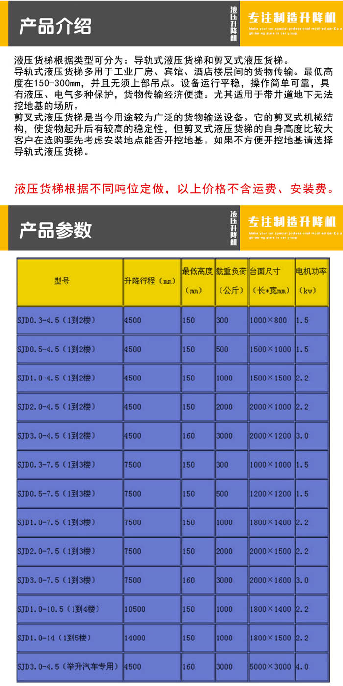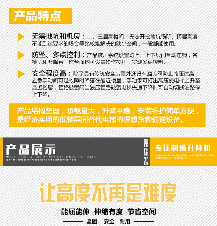 4、設(shè)備可按客戶提供的承載重量、起升高度、平臺尺寸或預(yù)留空間尺寸、使用場所非標訂制;